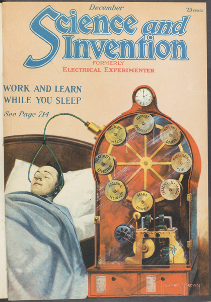 (1921, décembre). Learn and Work While You Sleep. Science and Invention, vol. 9, no. 8. Trouvé à : https://manifold.umn.edu/read/the-perversity-of-things-hugo-gernsback-on-media-tinkering-and-scientifiction/section/3b2fd145-07f5-4b15-bfbe-58aa8c493c45"